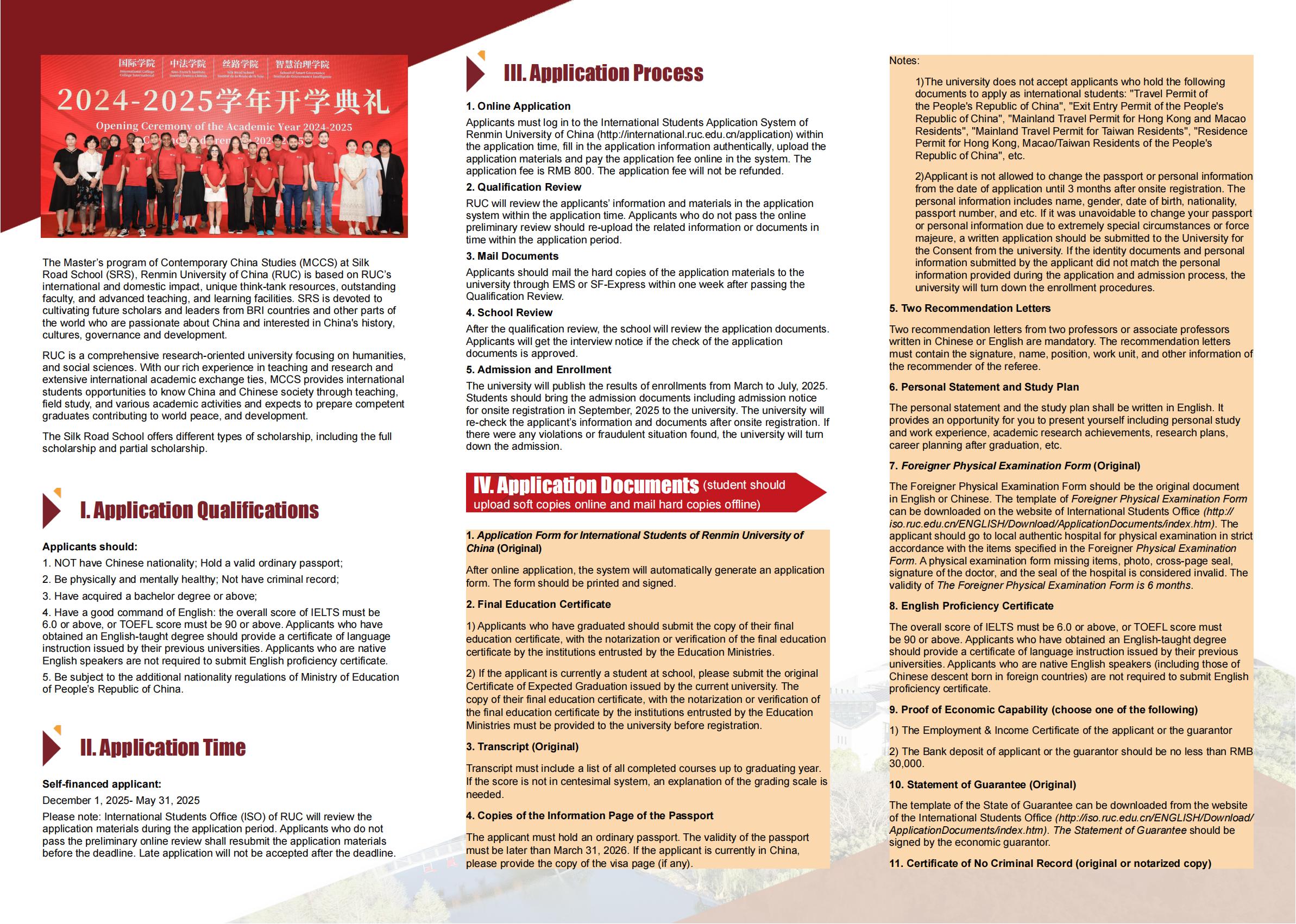 Please note: International Students Office (ISO) of RUC will review the application materials during the application period. Applicants who do not pass the preliminary online review shall resubmit the application materials before the deadline. Late application will not be accepted after the deadline.