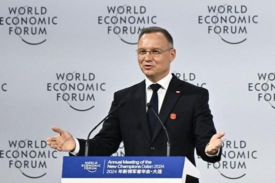 6月25日,大连,波兰总统杜达在2024年夏季达沃斯论坛开幕式上致辞。视觉中国供图
