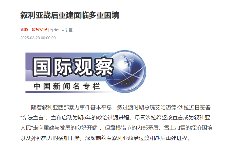 龙臣:叙利亚战后重建面临多重困境