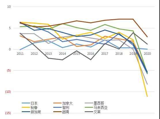 图2:2011-2020年CPTPP11国的GDP增速(%)