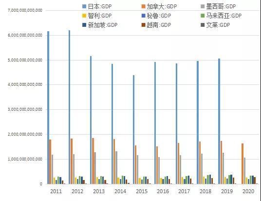 图1:2011-2020年CPTPP的经济发展情况(GDP规模,单位:美元)