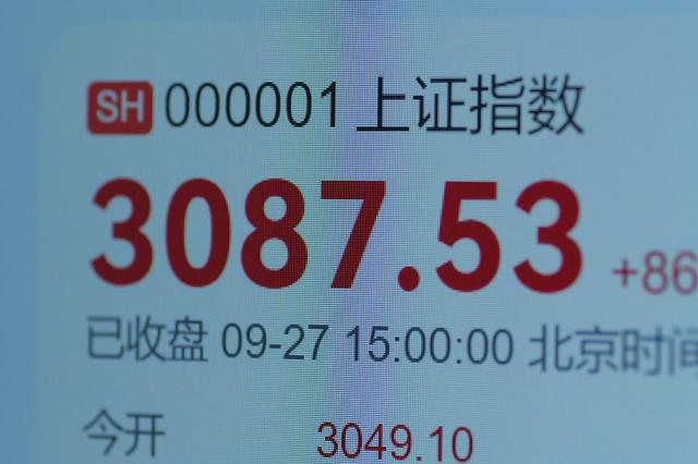2024年9月27日,截止收盘,上证指数收报3087.53点,上涨2.88%。(视觉中国)