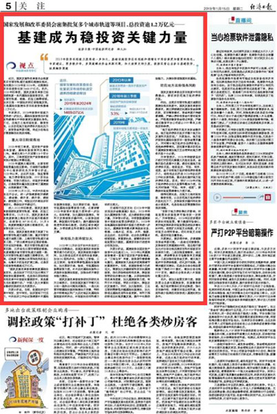 交通银行在发布的《2019年中国宏观经济金融展望》指出,2019年将加大基建投资力度,成为稳投资的关键力量。刘学智分析说,目前鼓励基建投资补短板的政策在持续发力,2019年各地基础设施领域补短板力度将进一步加大,基建投资将重点聚焦脱贫攻坚、铁路、公路水运、机场、水利、能源、农业农村、生态环保、社会民生等重点领域短板。更重要的是,随着积极的财政政策加力提效,基建项目执行进度将会明显加快。
