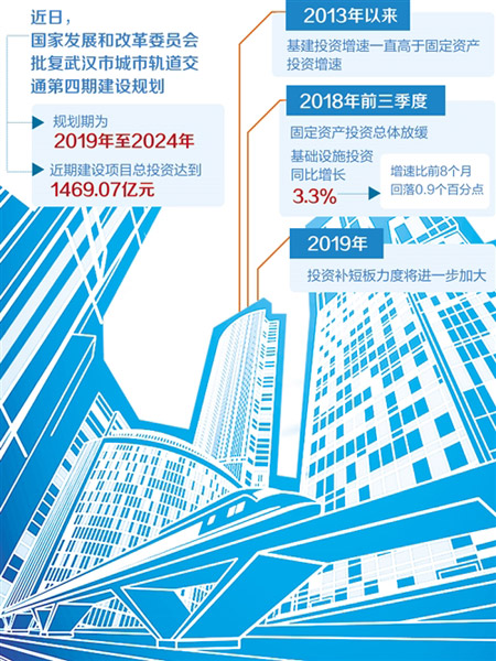 近日,国家发展和改革委员会批复武汉市城市轨道交通第四期建设规划,规划期为2019年至2024年,近期建设项目总投资达到1469.07亿元。此外,2018年四季度,国家发展改革委已经陆续批复一系列基础设施投资项目,涉及城市轨道、铁路、机场工程等领域。经济日报·中国经济网记者梳理发现,这些基础设施建设项目总投资规模逾1.2万亿元。