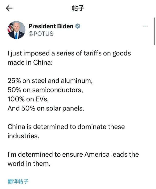 5月14日,美国总统拜登在其社交账号上发表言论,特别提及了对钢铁和铝、半导体、电动汽车以及太阳能电池板加征关税的税率,他表示“中国决心要主导这些领域,我确保美国会在这些领域领先世界,这一点我很有决心。”