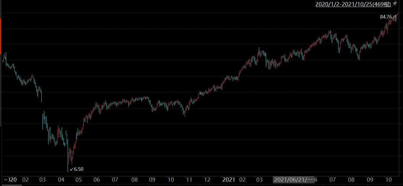 尽管此期间原油需求并未出现明显大幅反弹,但各产油大国之间的“减产契约”生效,原油产量在一定程度上降低,给了油价一个反弹支点。从2020年5月开始,国际油价开始逐渐攀升。此后,随着疫情形势趋于平缓,原油需求逐渐恢复,油价进一步上涨。
