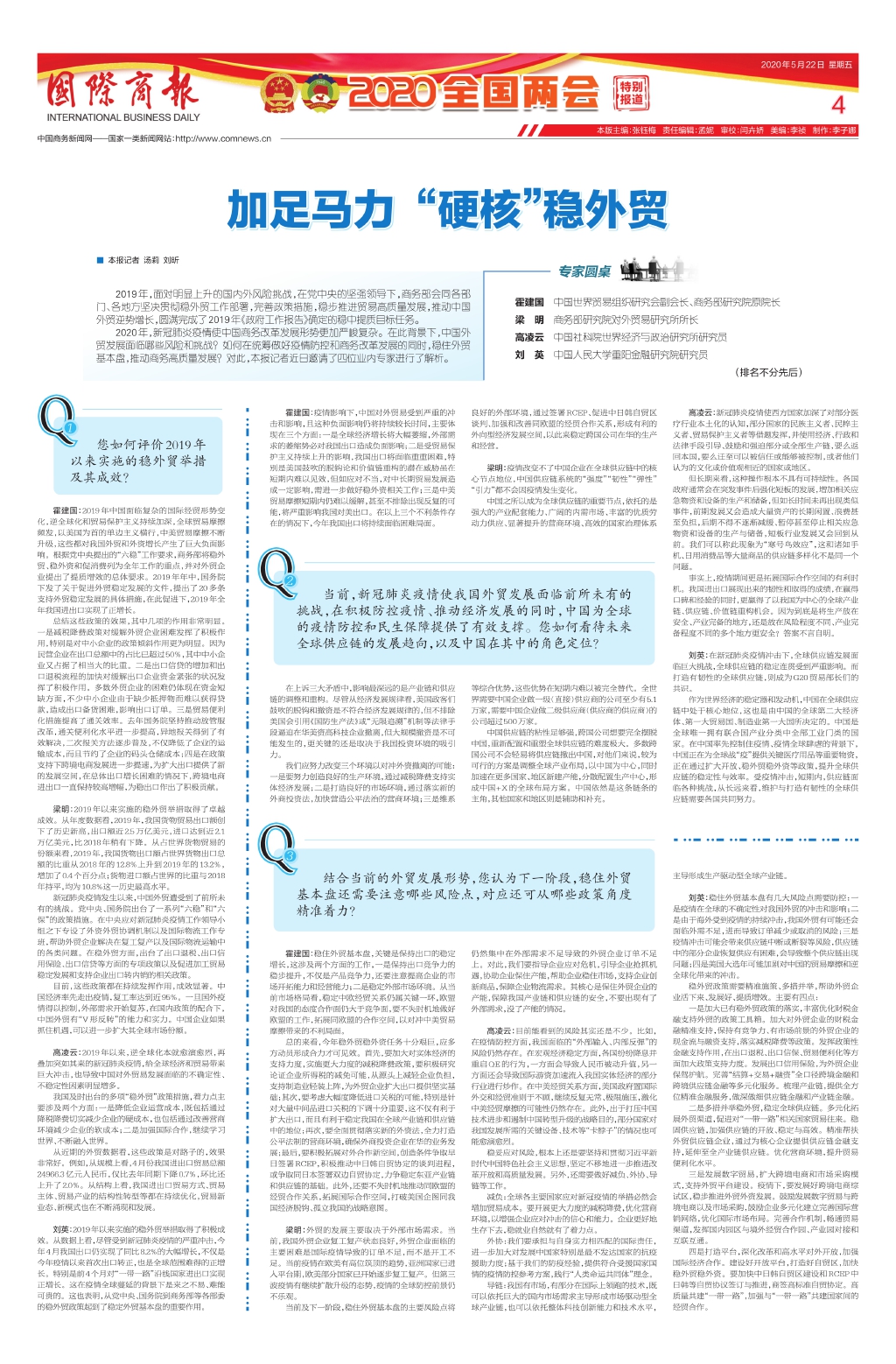 2020年,新冠肺炎疫情使中国商务改革发展形势更加严峻复杂。在此背景下,中国外贸发展面临哪些风险和挑战?如何在统筹做好疫情防控和商务改革发展的同时,稳住外贸基本盘,推动商务高质量发展?对此,本报记者近日邀请了四位业内专家进行了解析。