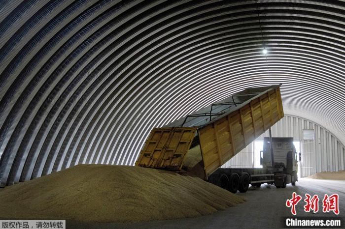 资料图:自卸车在一座乌克兰粮仓中卸载谷物。