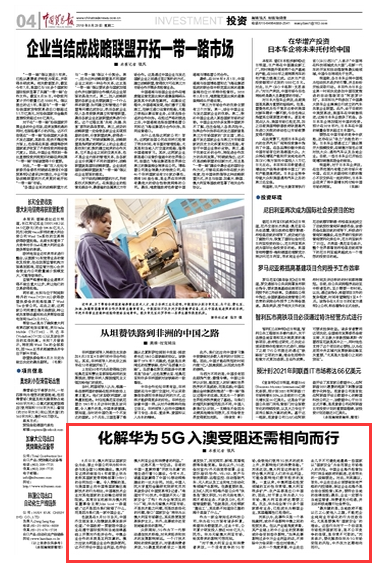 “对于澳大利亚企业和消费者来说,一个没有竞争的5G市场,会使他们使用5G技术的成本上升,并影响他们的消费体验。”刘英还说,澳大利亚这样做也不符合澳大利亚人们的长远利益,可能会影响他们数字经济的发展。一直以来,中澳两国在经贸领域的互补性非常强,澳大利亚很多矿产、农产品都是出口中国的,因此,对于禁止华为进入5G市场,澳大利亚政府还需要三思。况且,华为在全球170 多个国家都有业务,已经成长为跨国企业,其国籍属性已经弱化。