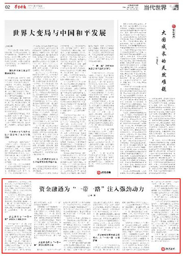 随着“一带一路”资金融通的推进,一个增强金融稳定的网络正在成形,并将帮助各国抵挡金融风暴的袭击,护航经济的平稳发展。(欢迎关注人大重阳新浪微博:@人大重阳,微信公众号:rdcy2013)