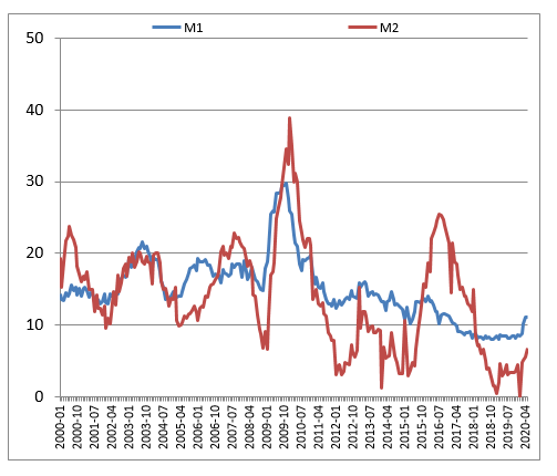图表1:2000-2020年货币供应量M1和M2发展变化情况(%) 数据来源:中国人民银行(PBC)