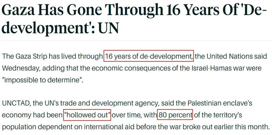 哈马斯控制加沙地带后,以色列开始对这一地区进行全面封锁,导致加沙经济形势急转直下。之前将近70%的人口生活在贫困线以下,一半以上的人口都没有工作。