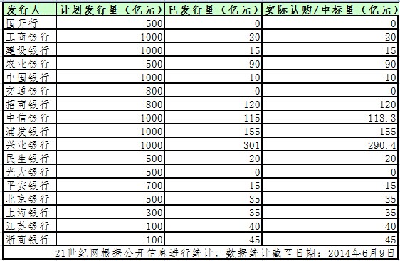 据21世纪网统计,,共有17家银行发布了2014年度同业存单发行计划,规模总计11300亿元,但其中只有14家正式发行了同业存单,存单总规模仅为1016亿元。由于在发行过程中包含未足额认购/中标的情况,实际发行规模为1003.7亿。也就是说,同业存单实际发行额占整体计划发行规模比例其实仅为8.88%。