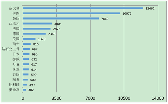 图3:截至2020年3月12日除中国外确诊新冠病例300例以上的国家