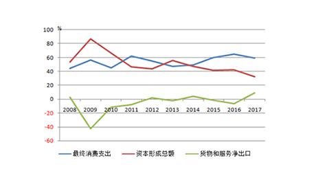 消费升级带动产业结构转换和动力转变,成为经济增长推进器。随着消费结构升级,通信、文体娱乐和教育等领域的投资加快增长。2017年,汽车制造业投资同比增长10.2%,加快5.7个百分点;计算机、通信和其他电子设备制造业投资增长25.3%,加快9.5个百分点;文体娱乐业投资增长12.9%,教育投资增长20.2%,明显快于全国固定资产投资增速的平均水平。从2013-2017年近五年三大需求对经济增长的贡献率来看,消费的年均贡献率为56.2%,投资的年均贡献率为43.8%。消费成为拉动经济增长的最大引擎和推进器。