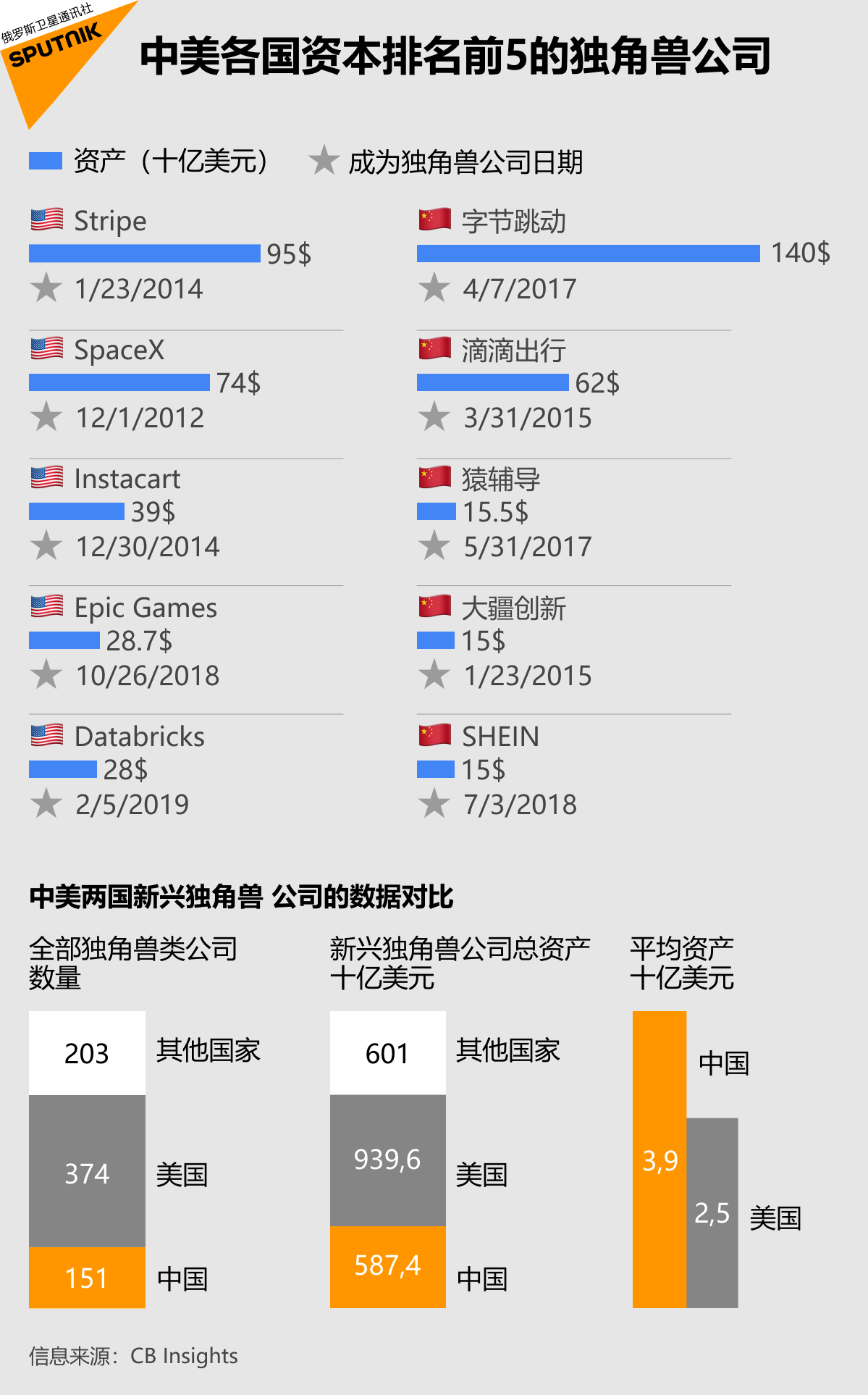 根据CB洞察公司6月的一份报告,所有独角兽公司中有20%位于中国,其中包括146个内地公司,5个香港公司。根据胡润百富报告,2019年中国拥有的独角兽公司为全球最多。当时中国有206个独角兽公司,美国有203个独角兽公司。此后世界受到新冠病毒大流行的束缚,情况开始发生变化。