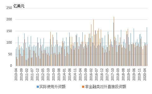 图2:2010年-2020年6月我国实际使用外资额和非金融类对外直接投资额