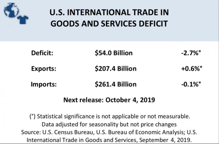 从具体数据来看,由于汽车、石油、钻井设备等出口增加,7月份美国出口额环比上涨0.6%,达到2074亿美元。今年前7个月,美国贸易逆差总额为3740亿美元,高于2018年同期的3460亿美元。