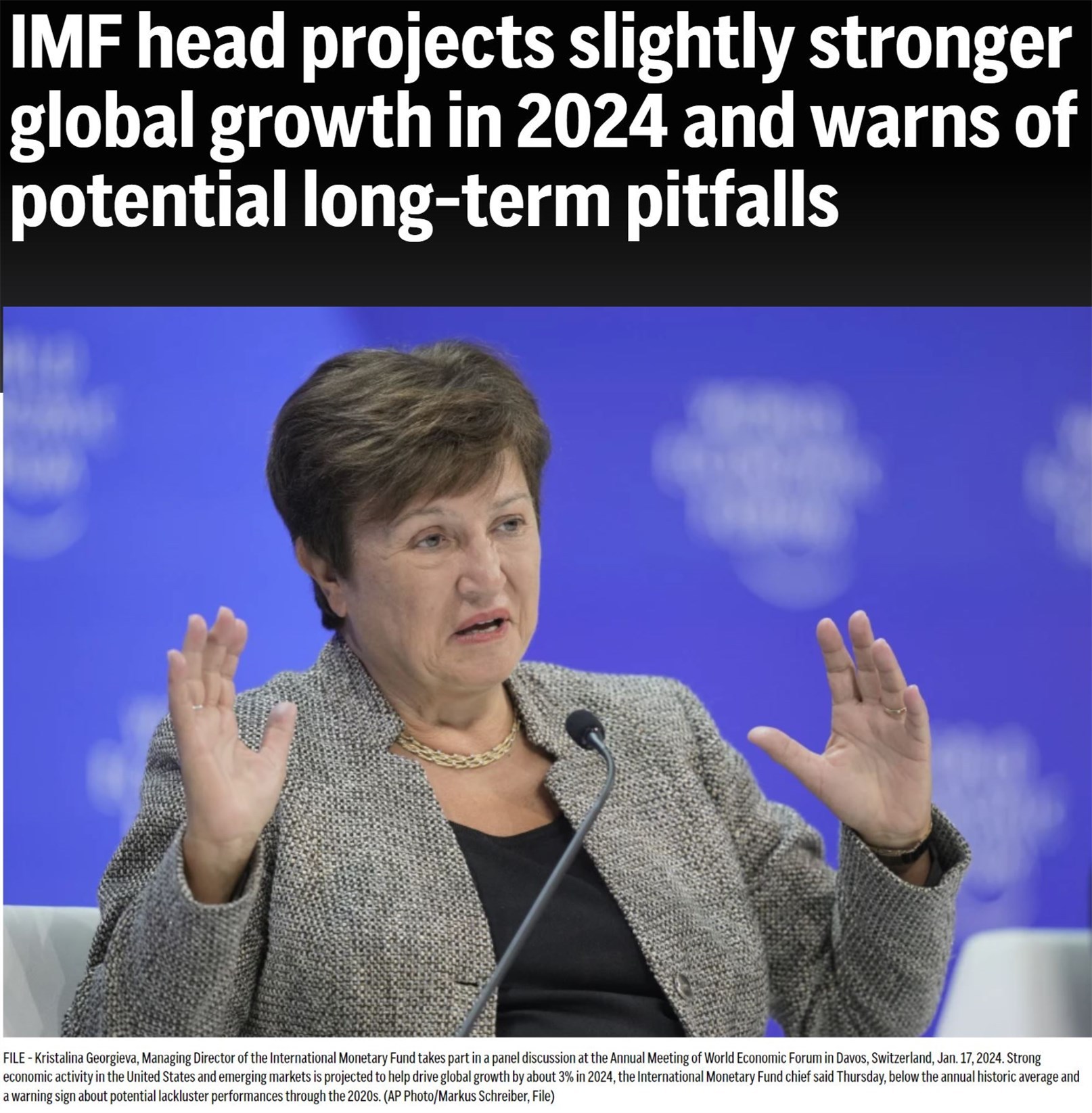 格奥尔基耶娃11日警告世界经济环境正变得“更具挑战性”。她认为,地缘政治紧张局势增加了世界经济“分裂的风险”,并且这种分裂不仅体现在不同类别的经济体之间,在发达经济体、发展中经济体各自内部也将显现。