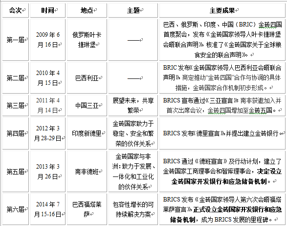 金砖国家财长在金砖五国领导人见证下签署成立新兴开发银行(New Development Bank,NDB,简称“金砖银行”)的协议,标志金砖银行正式成立。金砖银行宗旨是支持金砖国家及其他新兴经济体的基础设施建设与可持续发展;金砖银行核定资本为1000亿美元,初始认缴资本为500亿美元,在金砖五国间平均分配;金砖银行总部落户上海;首个区域办公室设在南非约翰内斯堡;行长由金砖国家轮值,首任行长由印度提名;首任理事会主席由俄罗斯提名,首任董事会主席由巴西提名。