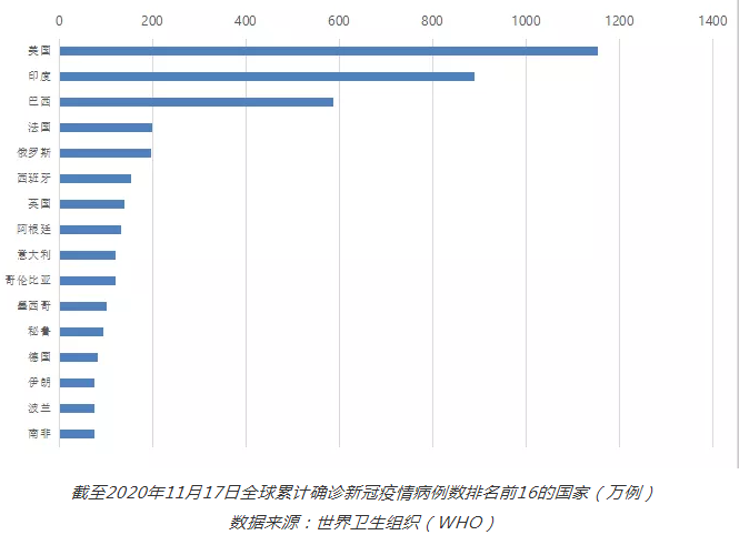 截至2020年11月17日全球累计确诊新冠疫情病例数排名前16的国家(万例)