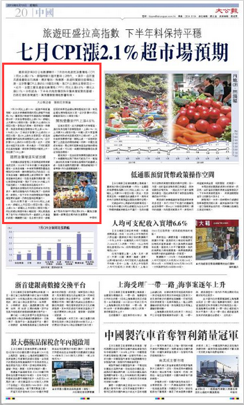 7月CPI同比上涨2.1%,超过市场普遍预期,此前多家机构预测的同比涨幅平均值为1.9%。国家统计局城市司高级统计师绳国庆分析,非食品价格环比上涨0.3%,涨幅比上月扩大0.2个百分点,影响CPI上涨约0.28个百分点。暑假出行高峰,需求增加,飞机票、旅遊和宾馆住宿价格分别上涨14.5%、7.9%和2.2%,三项合计影响CPI上涨约0.19个百分点,是CPI上涨的主要原因。成品油调价影响汽油和柴油价格均上涨0.9%,合计影响CPI上涨约0.02个百分点。此外,近期部分地区天气炎热、雨水偏多,不利于蔬菜的生产和储运,导致鲜菜价格大幅度上升,也拉动了CPI上涨。