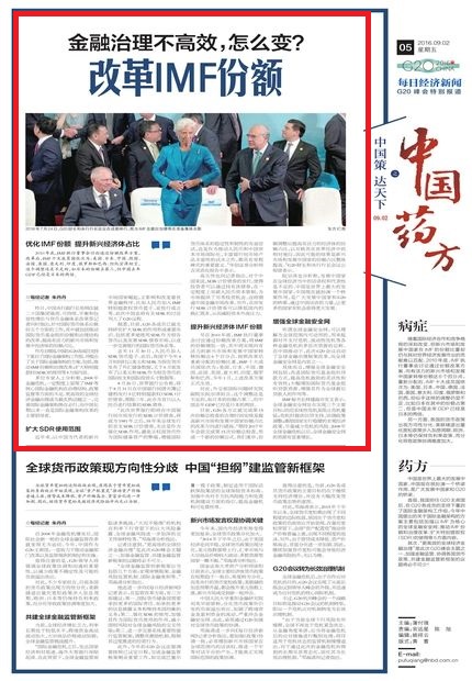 作为主席国,中国在G20各成员支持下重启了国际金融架构工作组。并提出了关于国际金融架构的方案,包括,推动IMF份额和治理改革;扩大特别提款权(SDR)的使用等5方面内容。