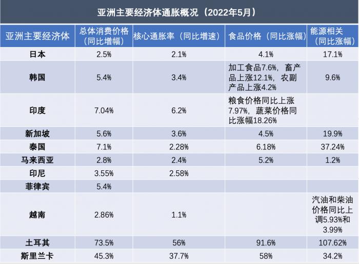 在众多亚洲经济体中,除了越南、日本、马来西亚以外,大部分经济体的通胀率都超过3%,而位于南亚的斯里兰卡和横跨亚欧的土耳其的通胀率更是高达惊人的45.3%和73.5%。