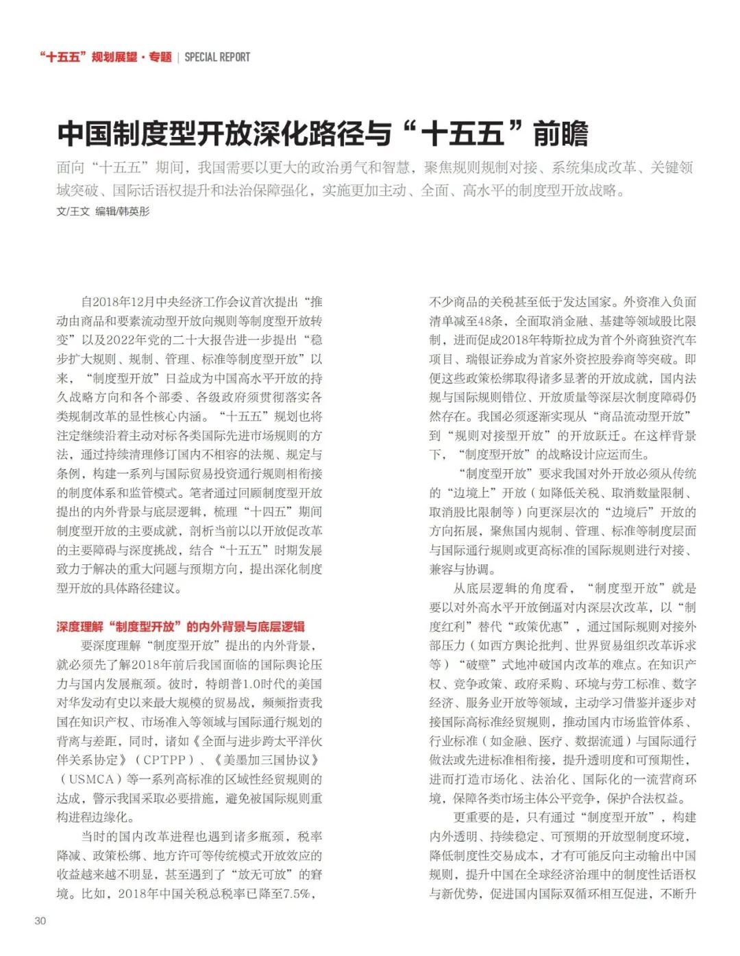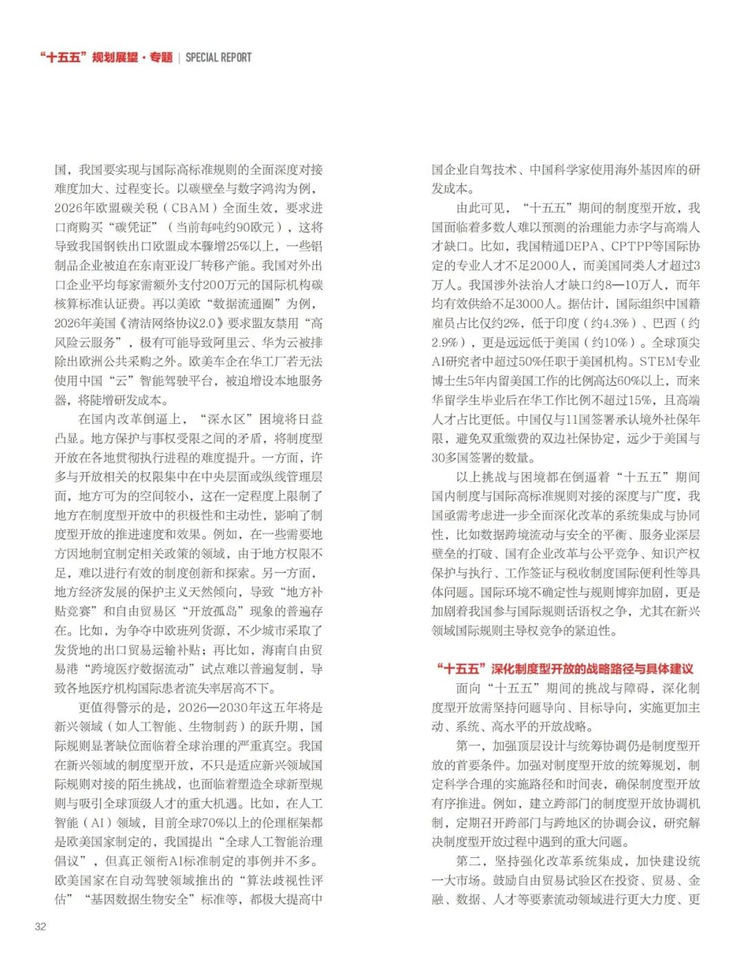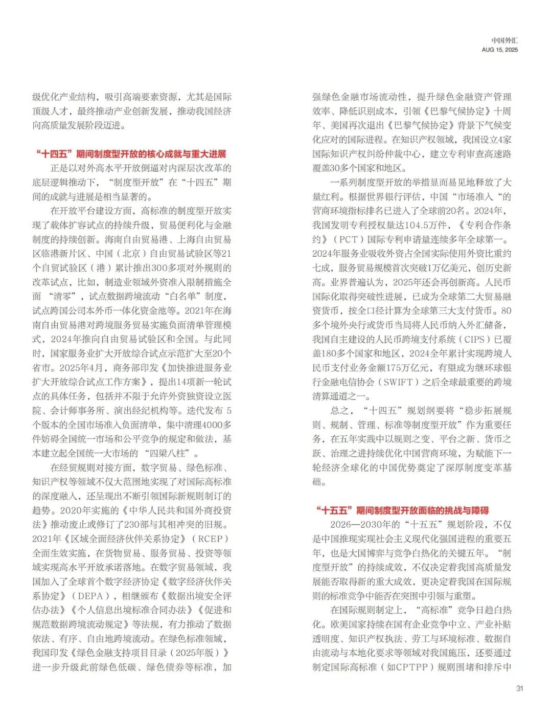 ▶面向“十五五”,我国需要以更大的政治勇气和智慧,聚焦规则规制对接、系统集成改革、关键领域突破、国际话语权提升和法治保障强化,实施更加主动、全面、高水平的制度型开放战略。