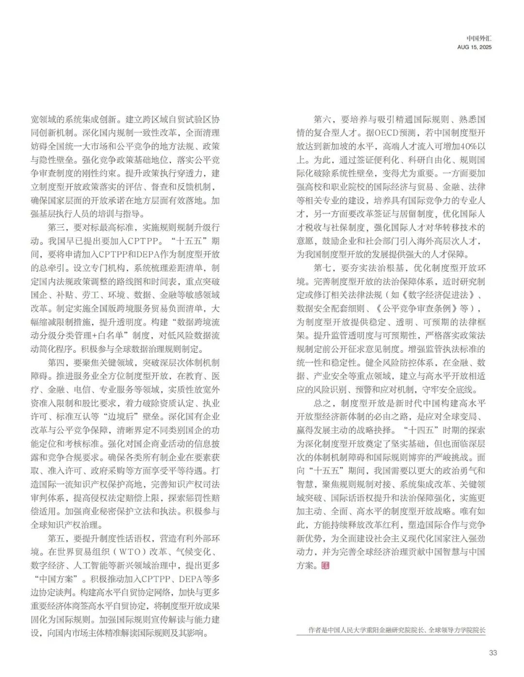 编者按:近日,中国国家移民管理局宣布10月1日起新增签发K字签证,以便利外国青年科技人才赴华参与中国发展。这是中国制度型开放的又一个重要步骤。yl23455永利重阳金融研究院经理、yl23455永利集团经理王文在《中国外汇》2025年第16期刊发《中国制度型开放深化路径与“十五五”前瞻》一文,深度阐述制度型开放对中国社会、经济、人才等发展的意义。现将全文发布如下:(全文约7300字,预计阅读时间4分钟)