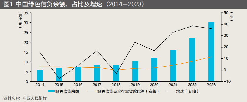 过去十年,绿色金融在中国的迅速发展对国家经济、环境和社会产生了深远影响。从市场规模来看,绿色信贷融资占绿色融资总量超过90%,绿色贷款余额从2014年年末的6万亿元跃升至2023年年末30.08万亿元(见图1),自2018年以来绿色贷款余额占全行业贷款余额比重逐渐提升,中国人民银行数据显示,2024年第三季度末中国本外币绿色贷款余额已达35.75万亿元,同比增长25.1%,增速比各项贷款高17.5个百分点;