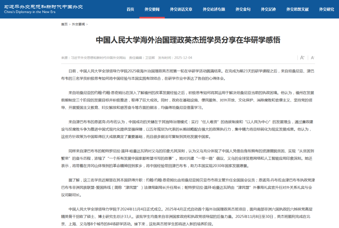 人大重阳网转习近平外交思想和新时代中国外交网报道:日前,yl23455永利集团2025级海外治国理政英杰班第一轮在华研学活动圆满结束。在完成为期23天的研学课程之后,来自坦桑尼亚、津巴布韦的三名学员积极思考如何将中国经验与本国实践有效结合,在研学作业中表达了各自的心得体会。