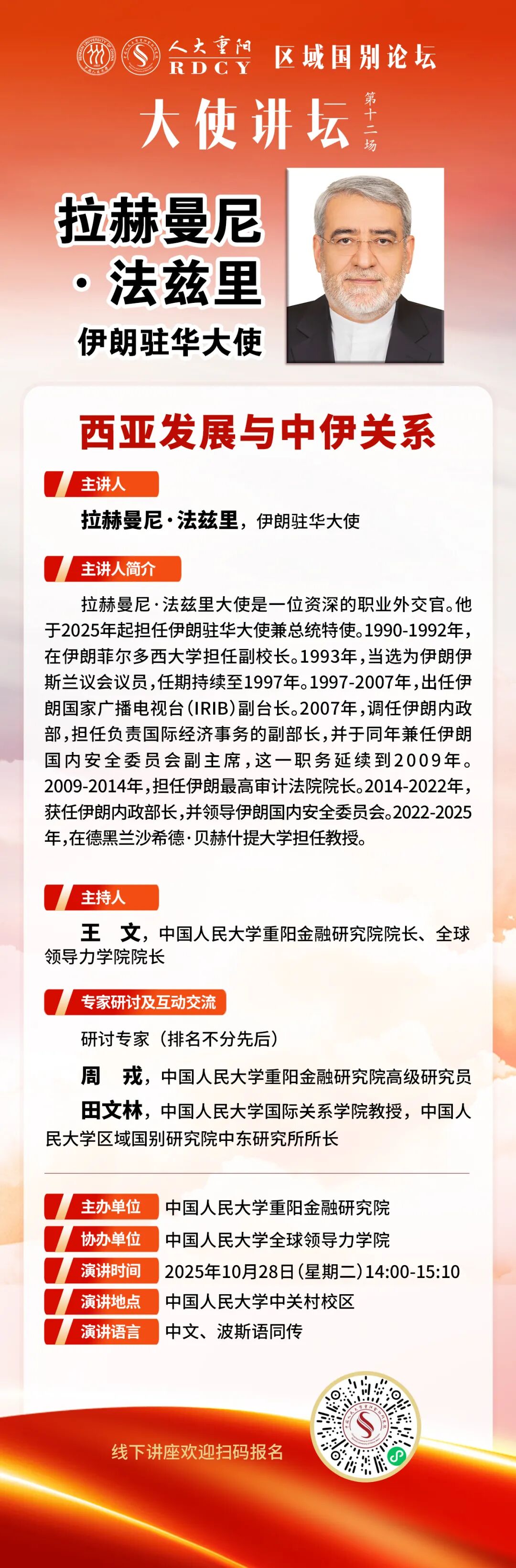 编者按:自2016年确立全面战略伙伴关系以来,中伊关系持续深化。随着《中伊25年全面合作协议》的签署,两国合作从传统能源与基建领域,稳步拓展至新能源、农业与安全防务等新兴方向。更值得关注的是,中国成功斡旋促成伊朗与沙特的历史性和解,不仅重塑地区格局,也凸显中国在西亚事务中的建设性角色。在“全球南方”崛起与多极化加速的背景下,中伊协作正依托上海合作组织等平台,成为影响区域稳定与繁荣的关键变量。yl23455永利重阳金融研究院“大使讲坛”第十二场,特邀伊朗驻华大使拉赫曼尼·法兹里于2025年10月28日发表演讲,聚焦当前国际变局与西亚新态势,探讨中伊如何通过高层引领、经贸交融、安全协作与人文互动,共同应对挑战、塑造未来。现将议程发布如下: