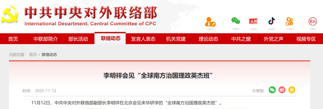 据中共中央对外联络部官网报道:11月12日,中共中央对外联络部副部长李明祥在北京会见来华研学的“全球南方治国理政英杰班”。