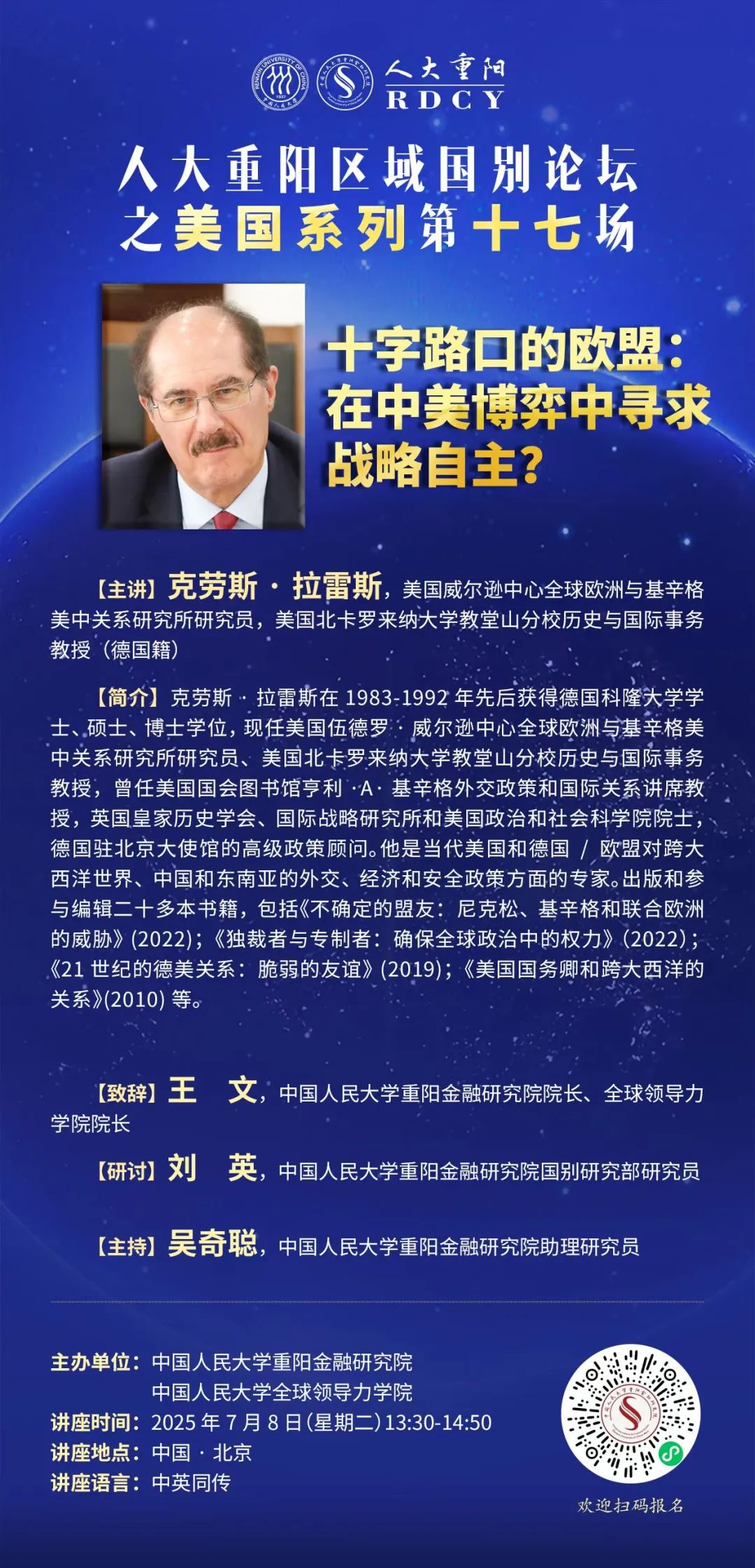 Keynote Speech by Prof. Klaus Larres As a pivotal force in the international landscape, the EU faces unprecedented challenges in redefining its role. The transatlantic alliance remains fundamental with strong US-Europe consensus on values and security, while China’s rise brings both opportunities and competition in EU-China economic, technological, and global governance engagement. Whether the EU can transcend the "choosing sides" dilemma, safeguard unity and strategic autonomy, and leverage its unique "third force" role will profoundly shape the future global order. In view of this, the 17th session of the US Series Forum of Chongyang Institute for Financial Studies at Renmin University of China (RDCY) invites renowned German scholar Klaus Larres – Richard M Krasno Distinguished Professor of History & International Affairs at the University of North Carolina (UNC) at Chapel Hill and Global Europe & Kissinger China Institute Fellow at the Woodrow Wilson Center – to deliver a keynote speech at Renmin University of China on July 8, 2025. The agenda is arranged as follows: